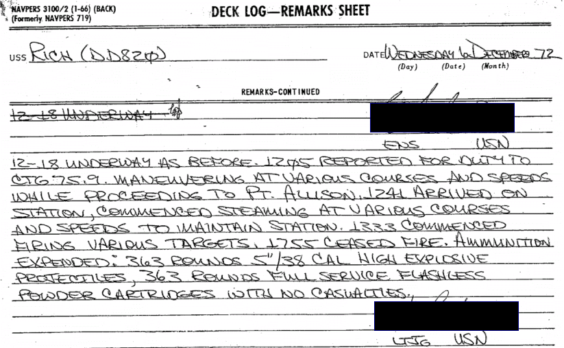 USS Rich Deck Log Entry excerpt on December 6, 1972.