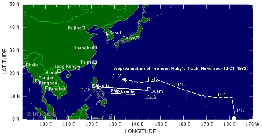 The next day, November 16, we began to experience an increase in winds and the seas caused by Typhoon Ruby. By today’s standards, Ruby would be a Category 3 Typhoon on the Saffir-Simpson Scale. The Saffir-Simpson Scale provides some indication of the potential damage and flooding a hurricane will cause at landfall, so it’s meaningless to a mariner at sea. The winds in this typhoon were forecast to reach up to 110 knots (126 mph).